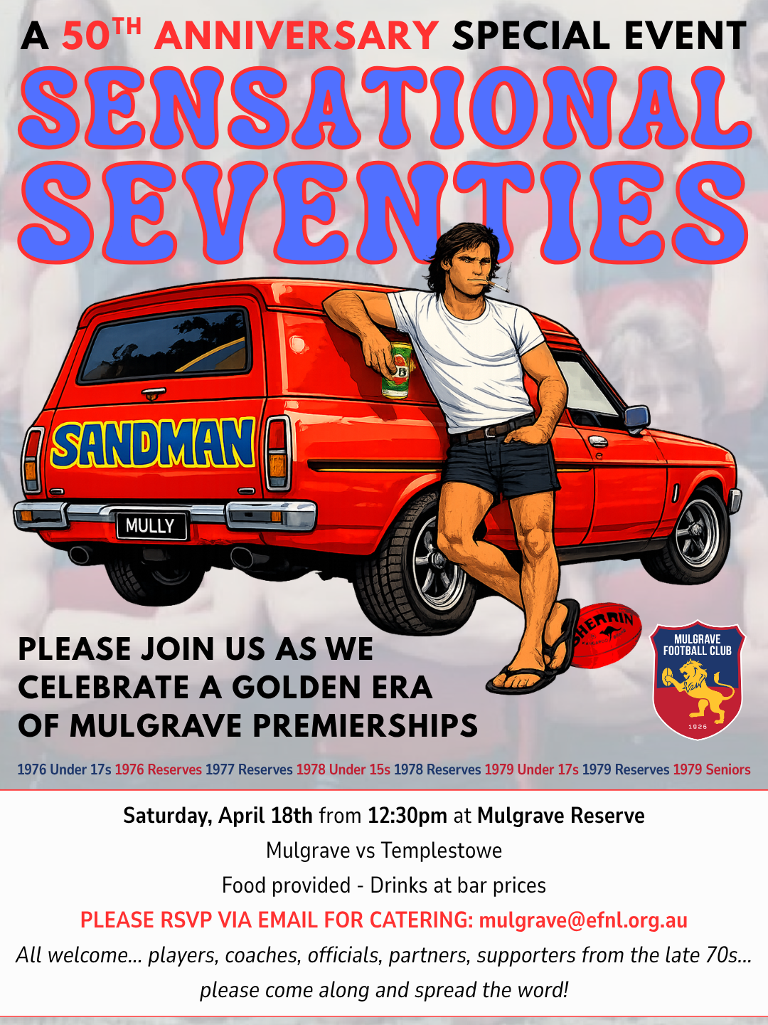 Players, coaches, officials, supporters, partners... we’d love to see everybody from the period back at Mulgrave on Saturday April 18th to catch up, share a few stories, and get behind the 2026 squad as they take on Templestowe.